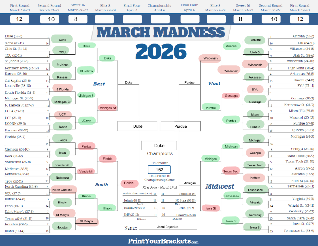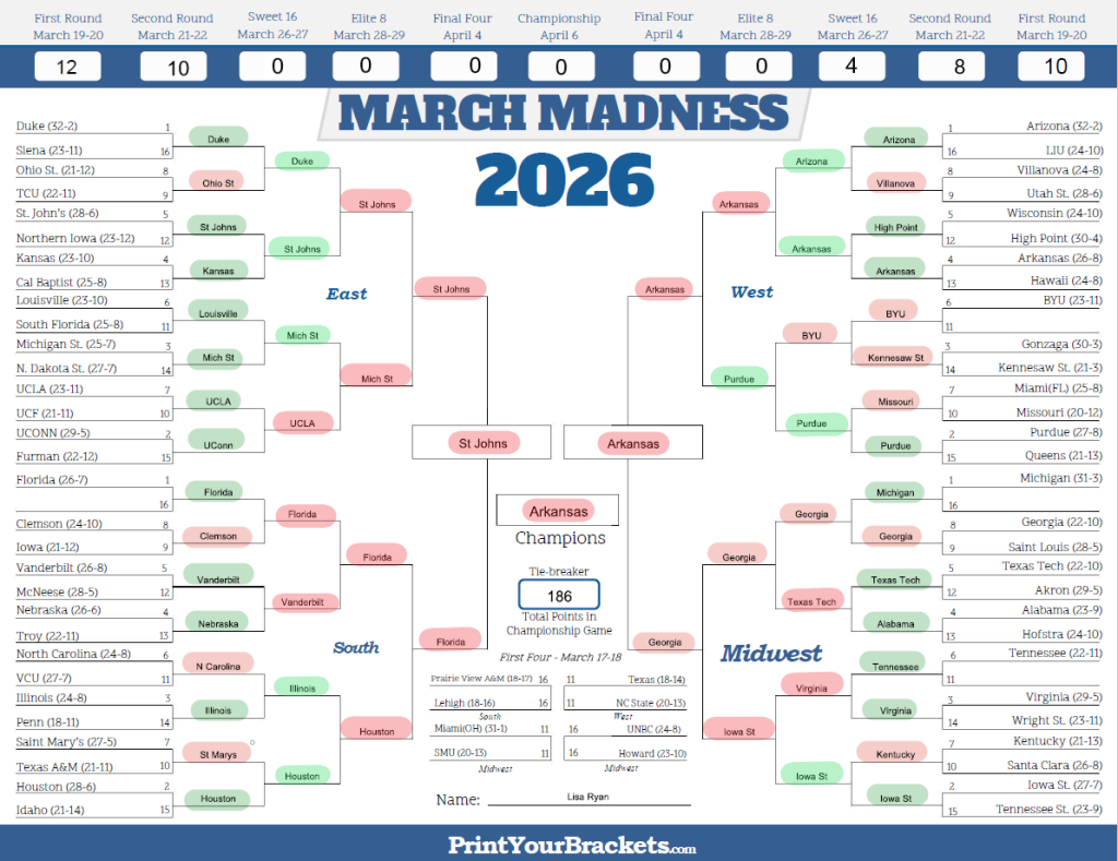 Scores will be posted here after each weekend of play. Winners will be announced after the championship game on Monday, April 7. Any ties will be broken by the score of championship game.