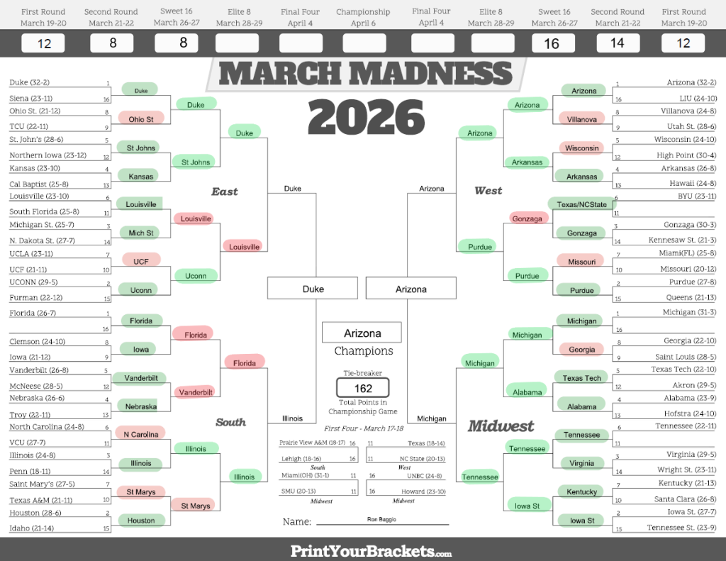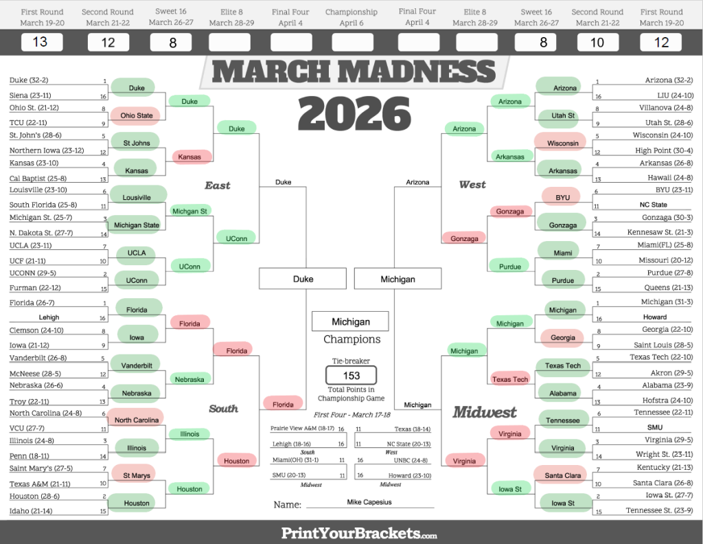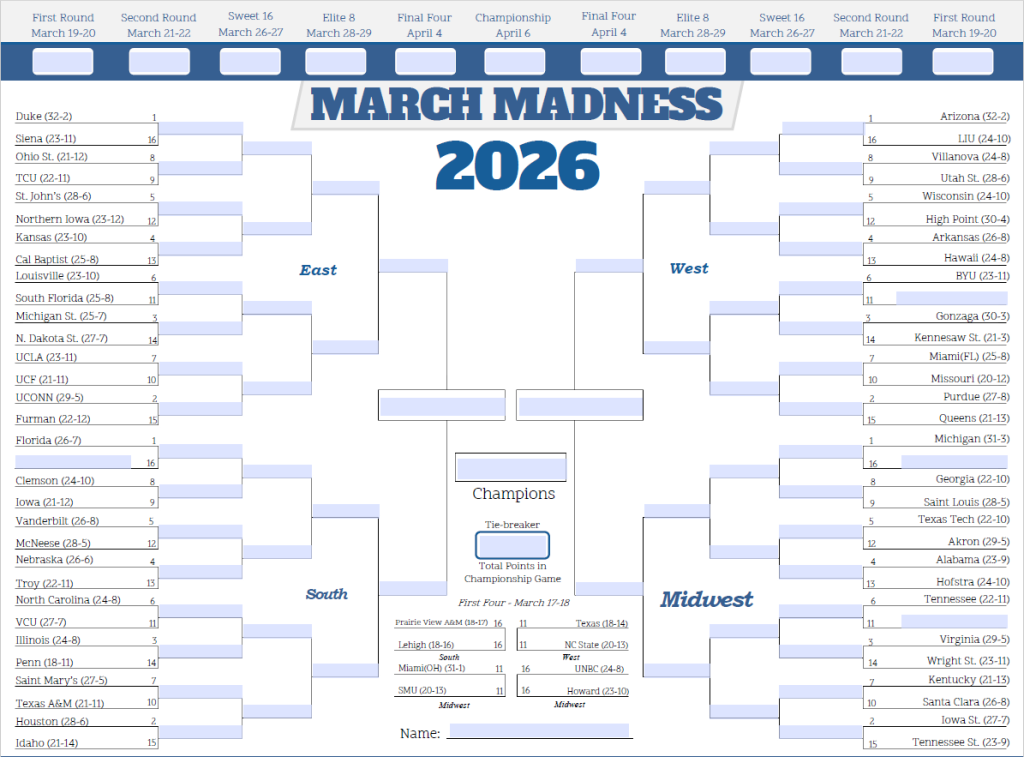 Click “Get Bracket Here” link above and fill out bracket with your projected winners in each round. First round winner can be entered into second round, with each winner for each round entered into next round, with winner of championship game entered into Champion box.